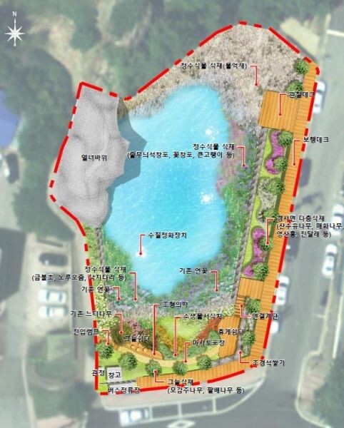이번 사업은 총사업비 6억원을 투입해 암하리 방죽 주변을 정비하는 사업으로 주요 내용은 수질정화장치 설치 수생식물 식재 휴게쉼터 조성 인근 주거지 보도역할을 겸하는 데크길 조성 등이며 군은 도시생태계 건전성 확보 및 차별화된 생물서식 중심의 생태공간을 조성해 군민에게 자연학습의 기회를 제공할 계획이라고 전했다.