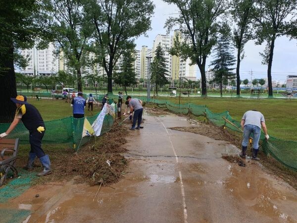 증평군 축구협회 회원 65명은 보강천 축구전용구장 복구작업, 증평군 자율방재단 20명은 보강천 부유물 제거 작업으로 구슬땀을 흘렸다.