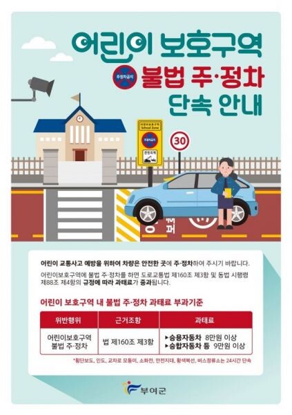 군 관계자는 “단속 구간은 부여군청 홈페이지 공지사항을 참고해 주시기 바라며 어린이 보호구역에 불법 주정차를 하지 않도록 협조해주시고 이번 제도 시행을 통해 어린이 보호구역 내 교통사고 예방과 안전한 통학로 조성을 위해 군민 여러분들의 많은 관심과 자발적인 협조를 바란다”고 당부했다.