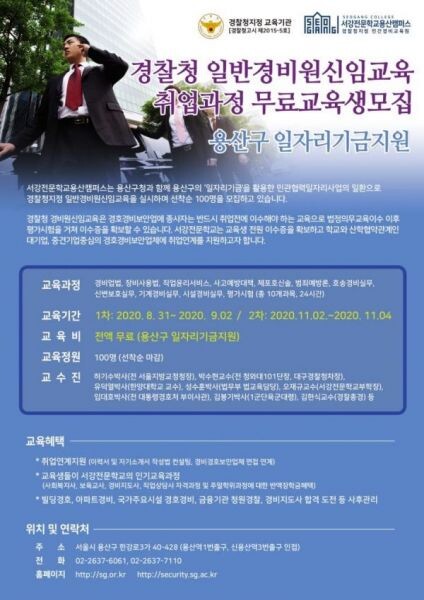 [무한뉴스] 서울 용산구가 2020년 구 일자리기금 민관협력 지원사업 일환으로 일반 경비원 신입교육· 취업과정 참여자를 모집한다.