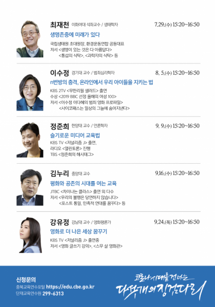 한국의 대표 생태학자인 최재천 교수, 범죄심리학의 권위자 이수정 교수, 미디어 비평의 지평을 넓히는 정준희 교수, 새로운 사회모델을 제시하는 김누리 교수, 영화로 나은 세상을 꿈꾸는 평론가 강유정 교수 등이 유튜브 실시간 생중계를 통해 충북의 교직원과 교육가족들을 만나고 있다.