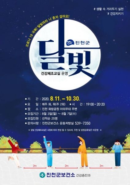 [무한뉴스] 진천군보건소는 오는 11일부터 10월까지 화랑공원 야외공연장에서 ‘달빛 건강 체조교실’을 운영한다고 5일 밝혔다.