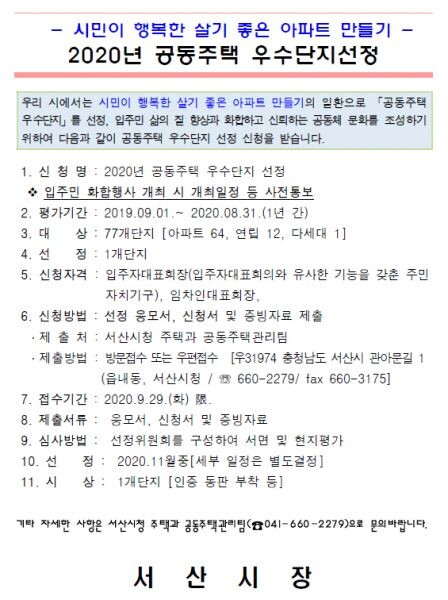 맹정호 서산시장은 “우수단지 선정과 모범사례 전파를 통해 행복하고 살기 좋은 아파트 문화를 정착해 나갈 수 있도록 노력해 나가겠다”고 말했다.