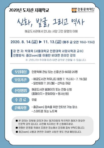 참여도서관으로 선정된 강동구립해공도서관은 ‘신화, 발굴, 그리고 역사’를 주제로 인문 심화 프로그램을 마련한다.