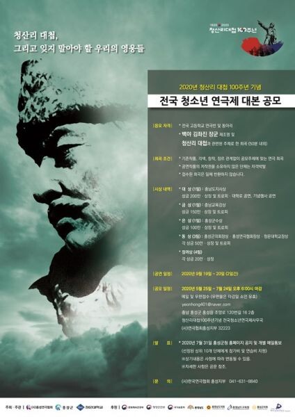 [무한뉴스] 홍성군은 청산리대첩 전승 100주년을 맞아 그 역사적 의미를 재조명하고 김좌진 장군의 숭고한 업적과 생애를 기리고자 전국 청소년연극을 공모하고 총8작품을 선정했다고 5일 밝혔다.