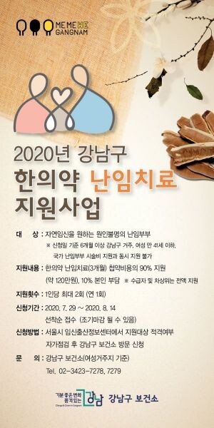 이번 사업은 서울시 한의약 난임치료 지원사업의 일환으로 신청일 기준 서울시에 6개월 이상 거주한 강남구민 중 사실혼을 포함해 자연임신을 원하는 원인불명의 난임부부면 누구나 신청할 수 있다.