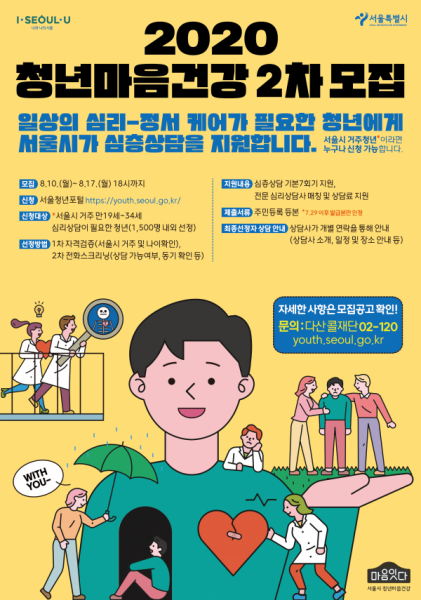 [무한뉴스] 서울시가 심리·정서적 문제를 겪는 2030 청년들에게 1:1 마음건강 심층상담을 무료로 지원하는 ‘청년마음건강 지원 사업’ 2차 모집을 시행한다.