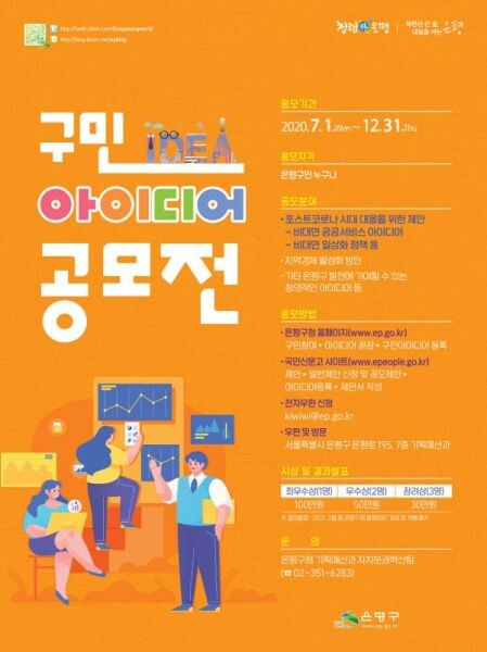 [무한뉴스] 은평구는 ‘2020년 하반기 구민 아이디어 공모전’을 통해 포스트 코로나 시대 대응을 위한 구민들의 참신한 아이디어를 모집한다고 밝혔다.