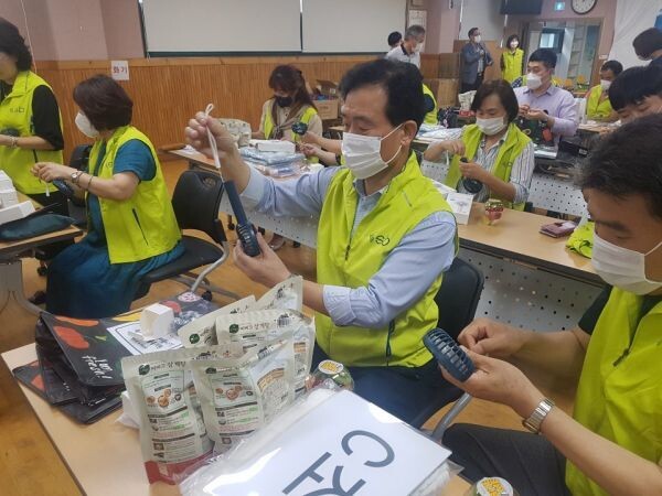 참석자들과 함께 관내 취약계층의 건강한 여름나기를 기원하며 쿨매트, 여름이불, 손선풍기, 삼계탕, 칫솔세트 등 냉방물품을 정성껏 담아 포장했다.