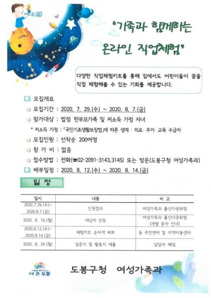 이동진 도봉구청장은 “코로나19로 인해 단체 체험캠프는 실시하기 어려운 상황이 됐지만 이번 온라인 직업 체험을 통해 가족과 돈독한 시간을 보낼 수 있는 기회가 되기를 바라며 앞으로도 저소득 가정 및 한부모 가족에게 실질적인 도움을 줄 수 있는 사업 발굴에 힘쓰겠다”고 전했다.