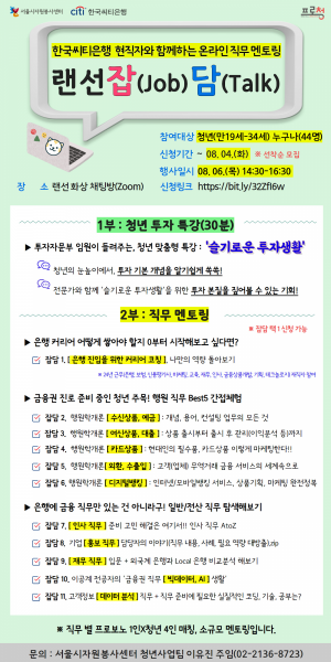 [무한뉴스] 서울시자원봉사센터는 6일 한국씨티은행 임직원과 함께 사회 진입을 준비하는 청년에게 직무 경험 및 지식을 나누는 프로보노 매칭데이, ‘한국씨티은행과 함께하는 온라인 직무 멘토링, 랜선잡담’을 개최했다고 7일 밝혔다.
