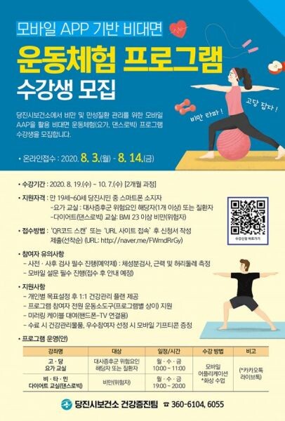 [무한뉴스] 당진시는 코로나19 장기화로 인해 지역 주민의 신체활동이 저하되는 것을 예방하고 비만 및 만성질환을 관리하고자 ICT 기반 비대면 운동체험 프로그램 시범사업에 본격 시동을 걸었다.