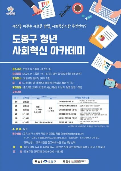 [무한뉴스] 도봉구는 미래 사회혁신의 주역으로 청년들이 보다 쉽게 사회혁신을 이해할 수 있도록 ‘도봉구 청년 사회혁신 아카데미’ 수강생을 모집한다.