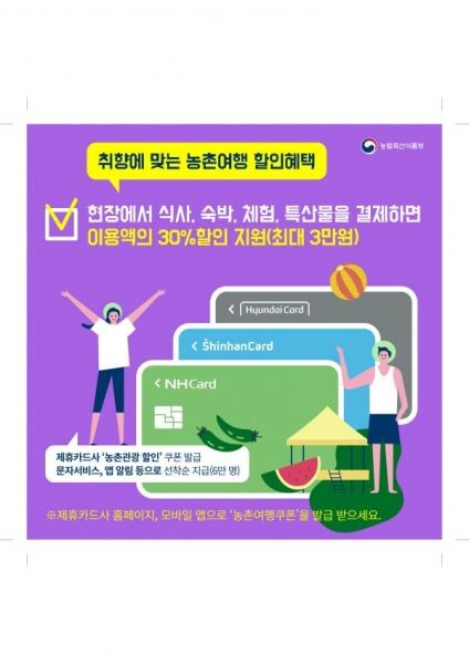 신청은 제휴카드사인 NH농협, 신한, 현대카드 홈페이지나 앱에 접속해 할인이벤트에 참여할 수 있으며 자세한 정보는 농촌여행 웰촌 홈페이지에서 확인할 수 있다.
