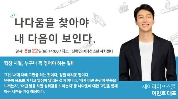 [무한뉴스] 당진시는 오는 22일 신평면 여성청소년자치센터에서 제이라이프스쿨 이민호 대표를 초청해 ‘나다움을 찾아야 내 다음이 보인다’를 주제로 제163회 행복아카데미를 개최한다.