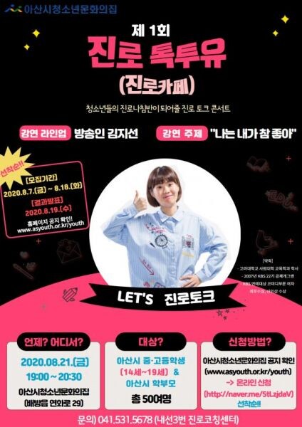 이번 진로톡투유는 방송인 박지선을 초청해 ‘나는 내가 참 좋아’라는 진로 강연을 진행할 예정이며 오는 8월 21일 아산시청소년문화의집 내에서 진행된다.