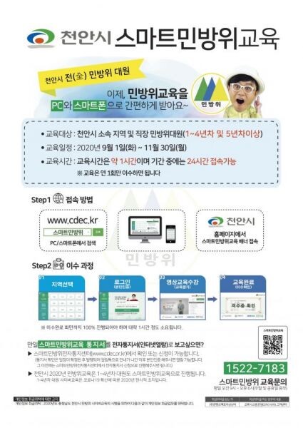 천안시 소속 전체 민방위 대원은 9월 1일부터 11월 30일까지 PC나 스마트폰으로 민방위 사이버교육 사이트에 접속해 약 1시간 과정의 교육을 이수하면 된다.