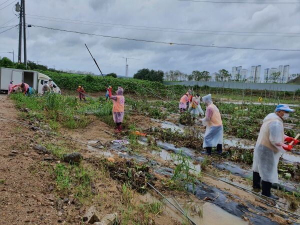 이날 봉사자들은 아침 일찍 아산시 배방읍 새교리 4950㎡ 규모의 채소밭에서 쓰러진 채소와 밀려든 쓰레기를 치우며 구슬땀을 흘렸다.