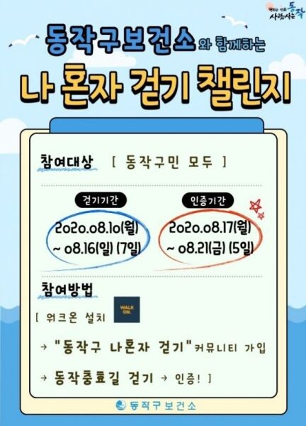 나혼자 걷기 챌린지는 동작구민 대상으로 집 주변 걷기 좋은 공원 또는 가정에서 걷기 어플 ‘워크온’을 활용한 걷기 프로그램을 매달 운영한다.