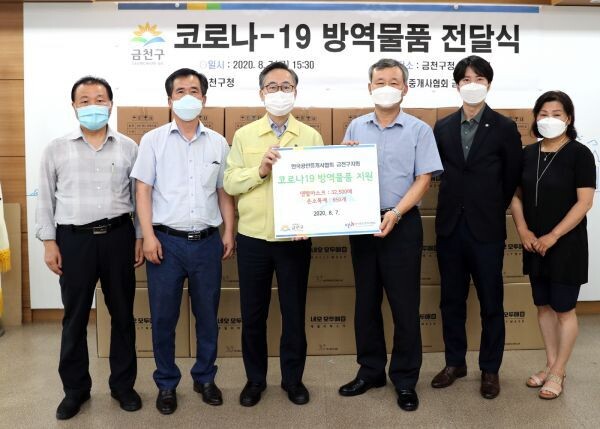 구는 지난 7일 전달식을 갖고 한국공인중개사협회 금천구지회에 코로나19 방역물품을 전달했다.