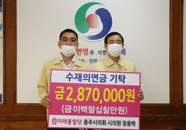 [무한뉴스] 충주시의회 정용학 의원이 최근 집중호우로 인해 큰 피해를 입은 수재민을 위해 11일 충주시를 통해 의정활동비 287만원을 기탁했다.