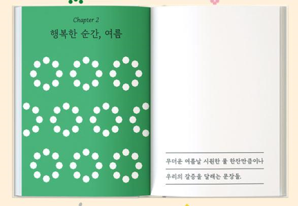 목차는 〔눈부신 마음,봄 행복한 순간, 여름 따뜻한 위로가을 기대의 날들,신년〕으로 구성되어 독자에게 계절별로 흐르는 감성을 선사하고 있으며 각각의 문장 밑에 창작 사연을 배치해 창작자가 전하고자 하는 메시지의 감동을 2배로 느낄 수 있다.