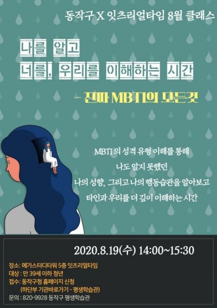 또한, 노량진 소재 스터디카페에서는 오는 19일 오후 2시부터 청년 5명을 대상으로 ‘MBTI를 통한 나와 너, 우리 이해하기’가 진행된다.