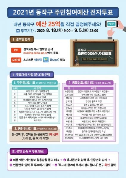 전자투표는 스마트폰 엠보팅 앱이나 홈페이지에 접속해, ‘2021년 동작구 주민참여예산 선정투표’에서 실행하면 된다.