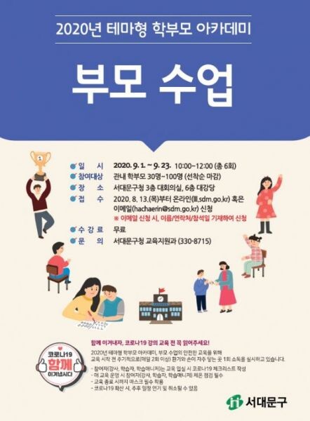 [무한뉴스] 서대문구가 바람직한 자녀 양육 방법을 제시할 2020년 테마형 학부모 아카데미 ‘부모 수업’을 오는 9월 1일부터 23일까지 모두 6회에 걸쳐 구청 대강당과 대회의실에서 개최한다.