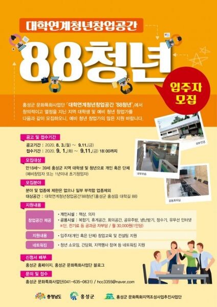 접수기간은 9월 1일부터 11일까지로 만 18세 ~ 39세 홍성군 거주 청년 및 대학생으로 청년 예비창업가 또는 1년 이내 초기 창업가면 입주가 가능하며 월 사용료는 1인 3만원이다.