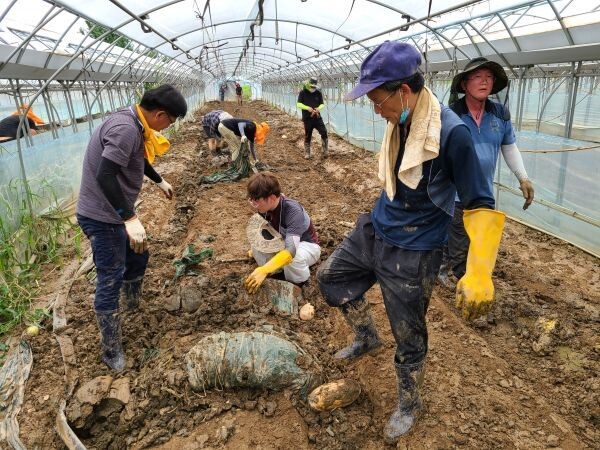 [무한뉴스] 농업정책국 직원 30여명이 이번 장마 집중호우로 큰 피해를 입은 오송읍 호계리 시설하우스 농가를 찾아 복구 작업에 어려움을 겪고 있는 농업인에 일손을 보탰다.