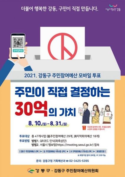 투표는 8월 31일까지 서울시 엠보팅 사이트에서 모바일투표로 진행하고 강동구정에 관심을 가지고 있는 사람 누구나 간단한 본인인증 절차를 거쳐 참여할 수 있다.