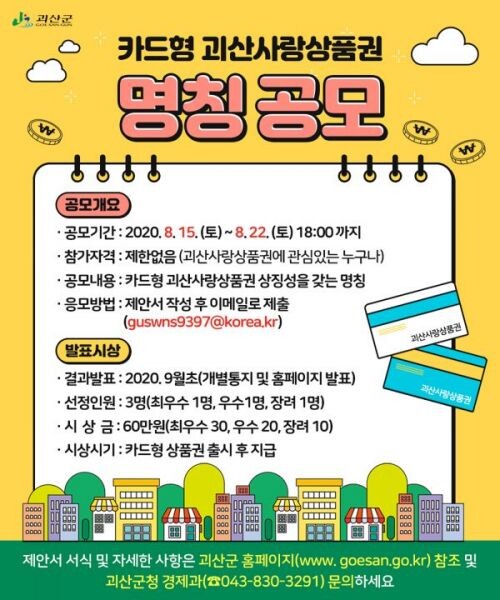 상금은 카드형 괴산사랑상품권으로 지급될 예정이다.