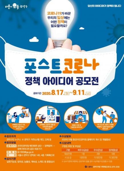[무한뉴스] 관악구는 코로나19 이후 시대에 효과적 대응방안을 모색하기 위해 8월 17일부터 9월 11일까지 ‘포스트 코로나 : 정책 아이디어 공모전’을 개최한다고 밝혔다.