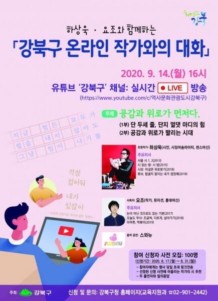 [무한뉴스] 강북구가 ‘하상욱·요조와 함께하는 온라인 작가와의 대화’를 오는 9월 14일 오후 4시 유튜브 ‘강북구’ 채널에서 실시간 방송한다.
