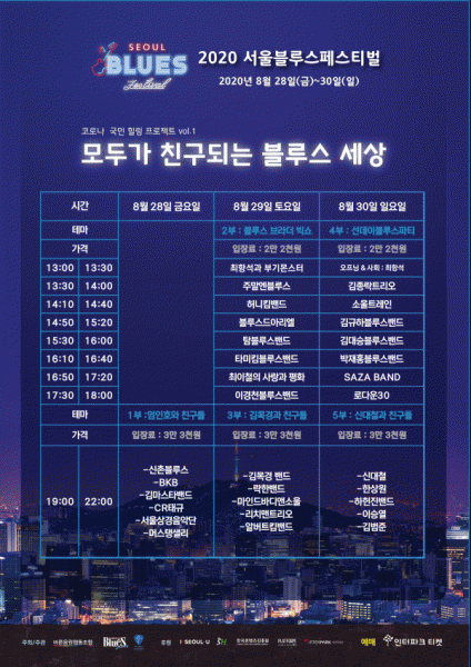 ‘2020 서울블루스페스티벌’ 티켓은 대한민국 블루스 명인들과 친구들 전석 33,000원, 한국의 블루스 뮤지션 전석 22,000원으로 인터파크 티켓에서 예매할 수 있다.