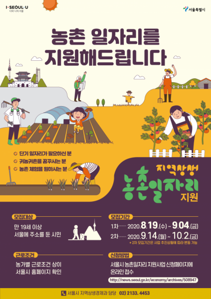 참여 희망자는 서울특별시 홈페이지에서 ‘농촌일자리 지원사업’을 검색하거나, 신청 페이지를 통해서 8월 19일부터 9월 4일까지 온라인으로 접수하면 된다.