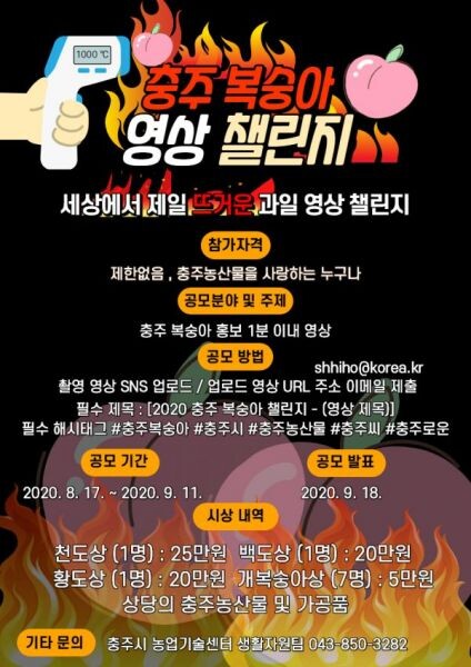 [무한뉴스] 충주시농업기술센터는 오는 9월 11일까지 ‘충주복숭아 홍보 영상 챌린지’를 공모한다고 밝혔다.