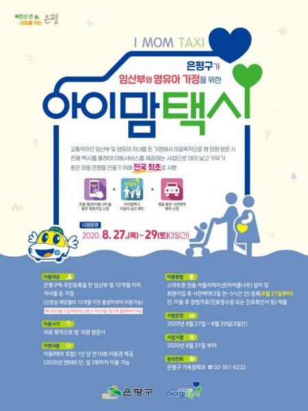 [무한뉴스] 은평구는 아이낳아 키우기 좋은 마을을 만들기 위해 ‘아이맘택시’ 사업을 올해 8월 27일부터 29일까지 3일간 시범운영을 실시하고 8월 31일 본격적으로 사업을 시행한다고 밝혔다.