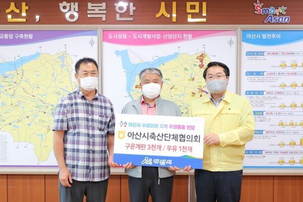 [무한뉴스] 아산시 축산단체협의회가 호우피해 복구를 위해 연일 힘쓰고 있는 자원봉사자들에게 지난 14일 격려 물품을 기부했다.