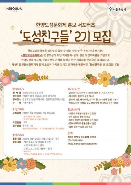 한편 서울시는 오는 10월에 개최되는 제8회 한양도성문화제를 홍보할 온라인 홍보 서포터즈 ‘도성 친구들 2기’를 모집한다.