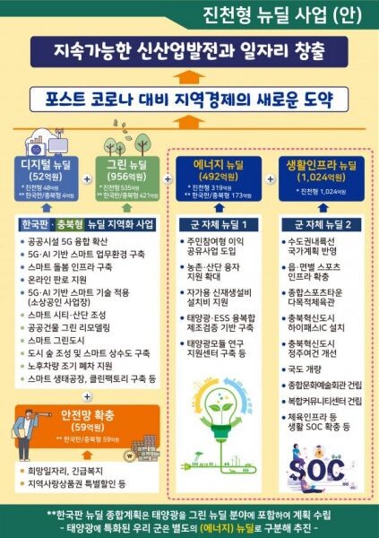 군은 정부에서 오는 2025년까지 3단계에 걸쳐 160조원에 달하는 대규모 뉴딜 예산을 투입하는 것을 고려, 이달 31일 ‘진천형 뉴딜’ 추진전략 보고회를 개최하고 9월 말까지 세부내용을 확정할 계획이라고 전했다.