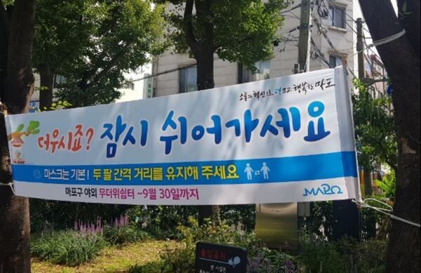 야외 무더위쉼터 16개소는 마포구 자원봉사센터의 봉사자들이 관리를 맡아 방문자 마스크 착용 및 발열 체크, 이용자 간 거리두기 안내, 쉼터 내 소독 등 코로나19 감염 예방을 위한 방역 수칙을 철저히 이행하고 있다.