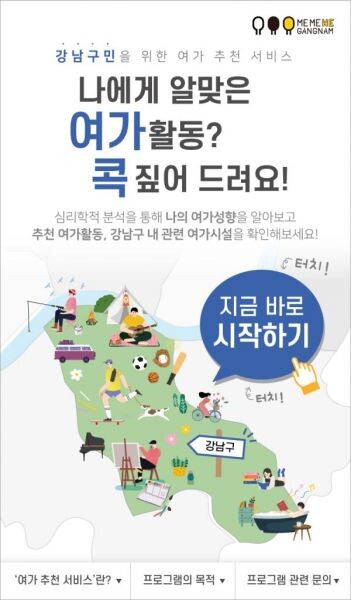 [무한뉴스] ‘기분 좋은 변화, 품격 있는 강남’을 구현 중인 강남구가 구민들의 성별과 나이, 성격을 반영해 여가활동을 추천해주는 전국 지자체 최초의 맞춤형 여가추천 서비스 ‘여가콕’을 20일 오픈했다.