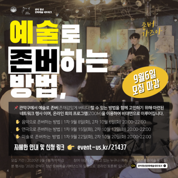 ‘관악청년 문화예술상생테이블’은 음악, 연극, 미술 3개의 주제별로 총 2회씩, 오는 9월 8일부터 10월 20일까지 매주 화요일마다 진행되며 오후 8시부터 10시까지 온라인 회의 프로그램을 이용해 비대면으로 이루어진다.