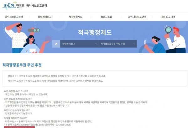 또한 구는 적극행정 구현을 위한 노력의 일환으로 지난 7월 공익제보신고센터 홈페이지 내 적극행정 코너를 마련했다.