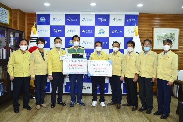 [무한뉴스] 옥천군의회에서는 24일 군수실에서 용담댐 방류로 인한 수해와 코로나19로 위기에 처한 가정을 지원하고자 옥천군의회 의원과 충북시군의회 의장협의회 각 200만원, 보은군·괴산군의회 각 100만원을 합쳐 총600만원을 전달했다.