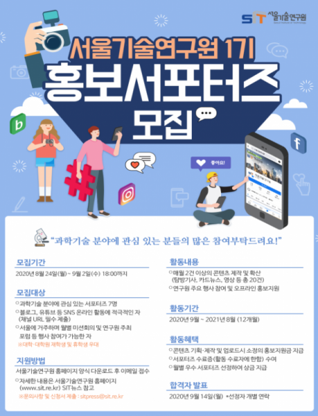 모집대상은 과학기술에 관심을 가지고 있는 서울시민 7명을 선발할 예정이며 기존 SNS 활동이 활발하고 카드뉴스, 탐방기사, 동영상 등의 콘텐츠 제작이 가능한 시민이면 누구나 신청할 수 있다.