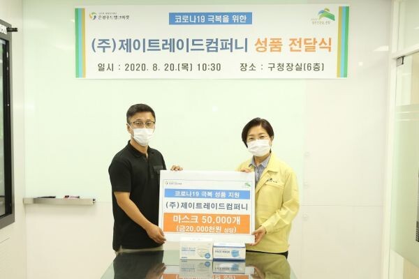 [무한뉴스] 은평구는 지난 8월 20일 ㈜제이트레이드컴퍼니와 코로나19 위기 극복을 위한 성품 전달식을 가졌다.