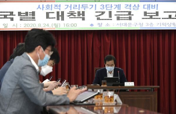 [무한뉴스] 서대문구는 신종 코로나바이러스 감염증의 전국적인 재확산과 관련해 지난 24일 오후 구청 기획상황실에서 간부 직원들이 참석한 가운데 사회적 거리두기 3단계 격상에 대비한 긴급회의를 열고 대책을 논의했다고 밝혔다.